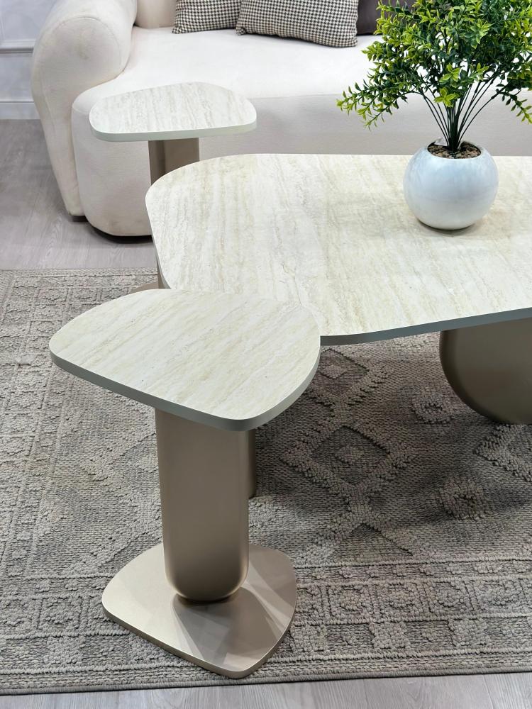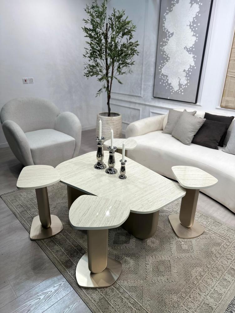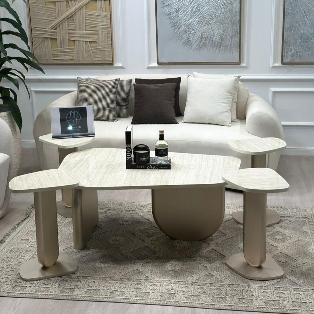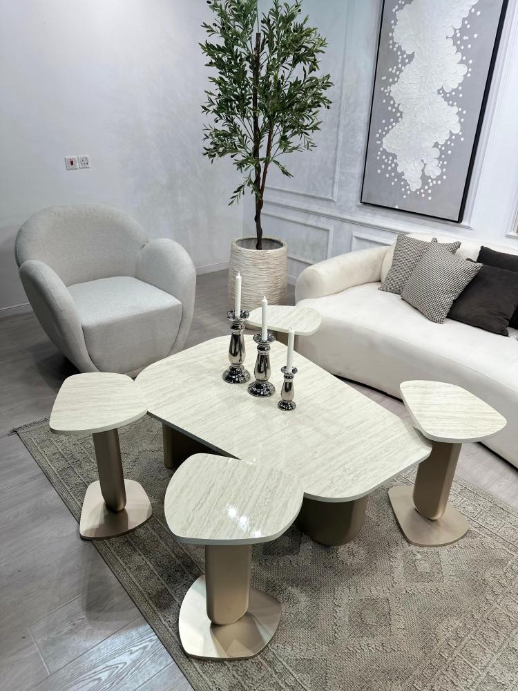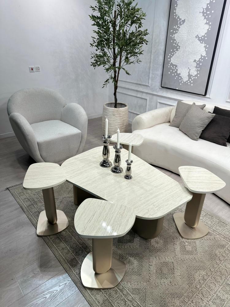 • طقم طاولة القهوة الفاخر هذه: . يتضمن طاولة وسط و4طاولات جانبية، جميعها مصنوعة من بديل الرخام الترافنتينوا الناعم عالي الجودة وخشب ام دي اف ،،يضيف الشكل للطاولات لمسة من الأناقة إلى أي مساحة، بينما يضمن البناء الخشبي الصلب القوي المتانة وطول العمر.