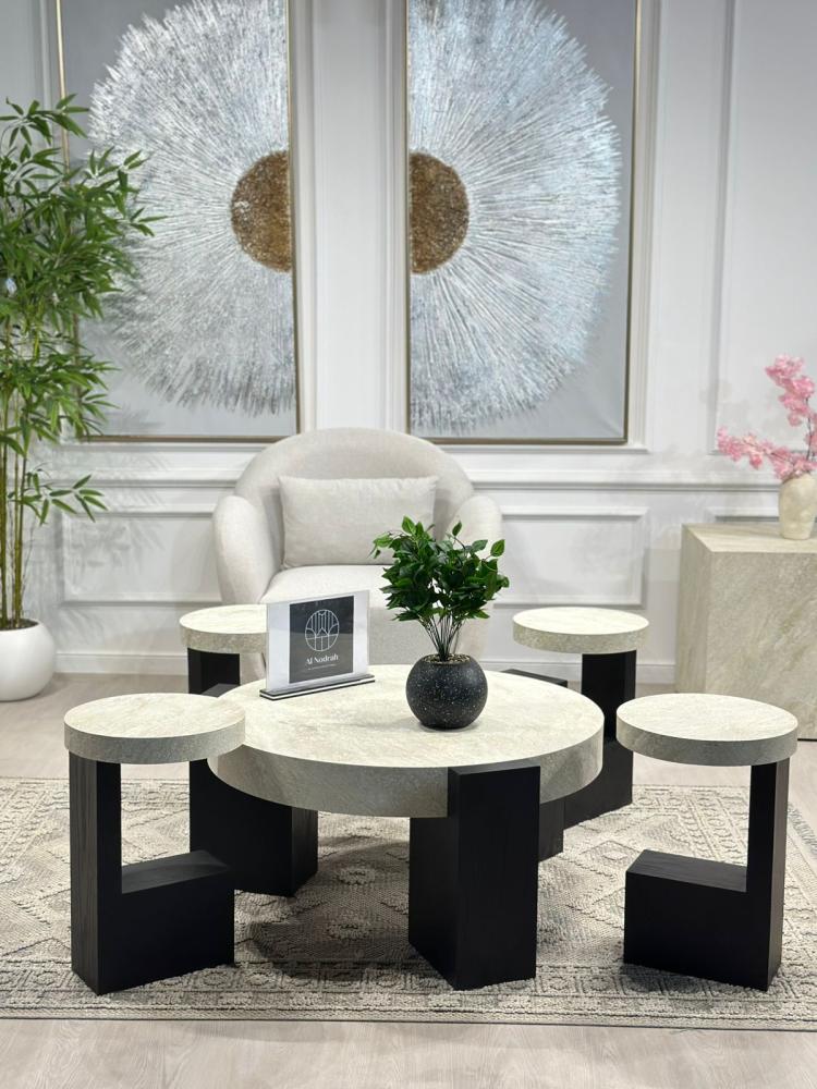 طقم طاولات 5 قطع فاخرة: سطح بديل رخام حجري بروفايل دائري وقاعدة خشب قشرة السنديان اسود بتصميم جديد، مما يضفي لمسة من الفخامة والأناقة على ديكور منزلك. هذه الطاولات مثالية للاستخدام بجانب الأريكة أو كقطعة ديكور بارزة في غرفة المعيشة.