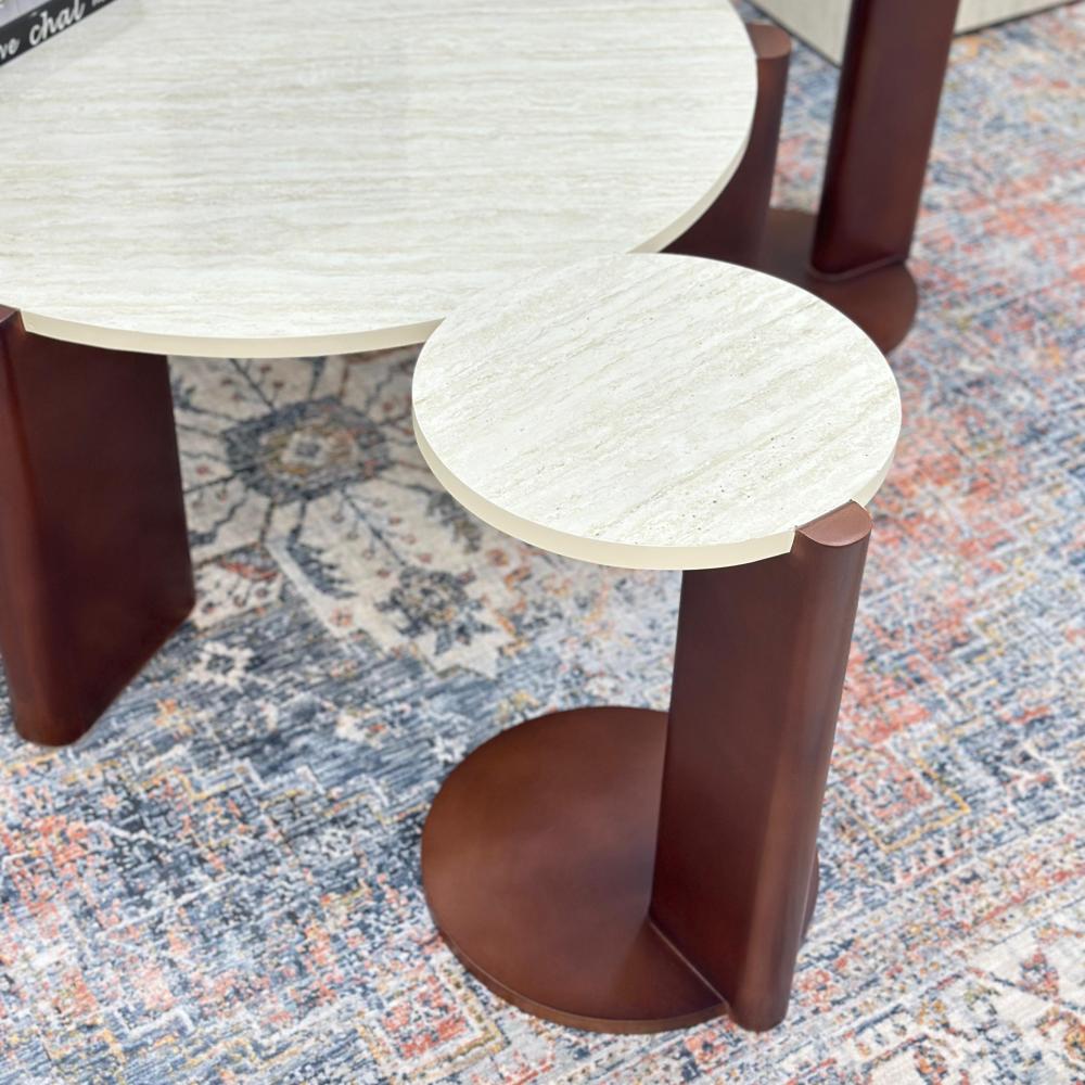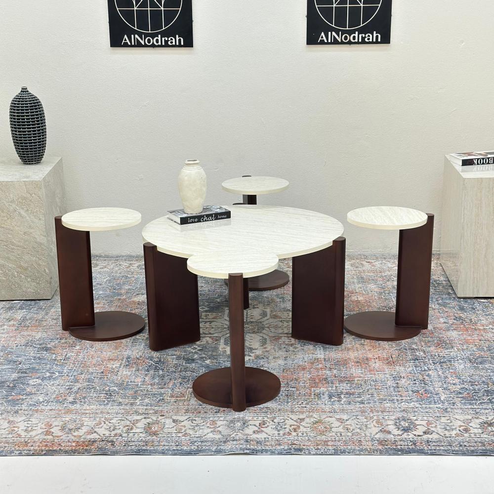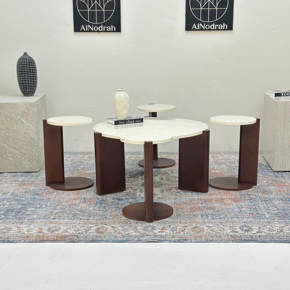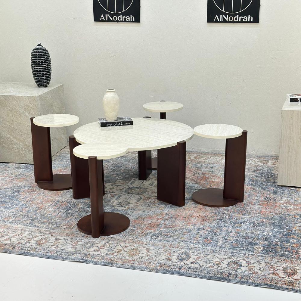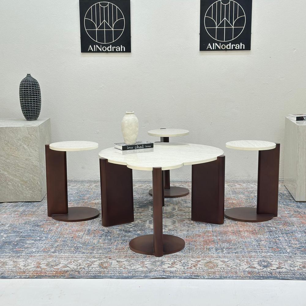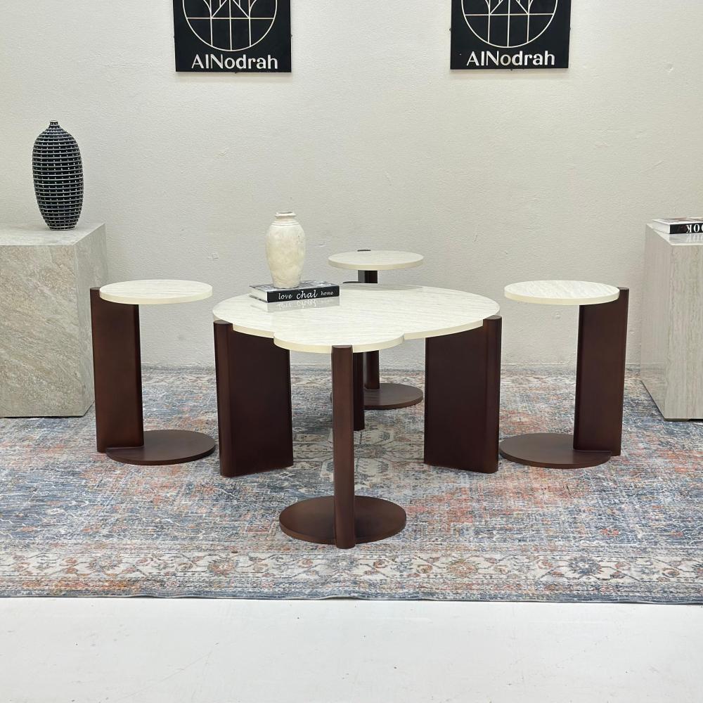 طقم طاولة التقديم الفاخر هذا إضافة مثالية لأي غرفة معيشة. يتضمن طاولة وسط و4طاولات جانبية، جميعها مصنوعه من بديل الرخام عالي الجوده والخشب الصلب ، يضيف الشكل الدائري للطاولات لمسة من الأناقة إلى أي مساحة، بينما يضمن البناء الخشبي الصلب القوي المتانة وطول العمر.