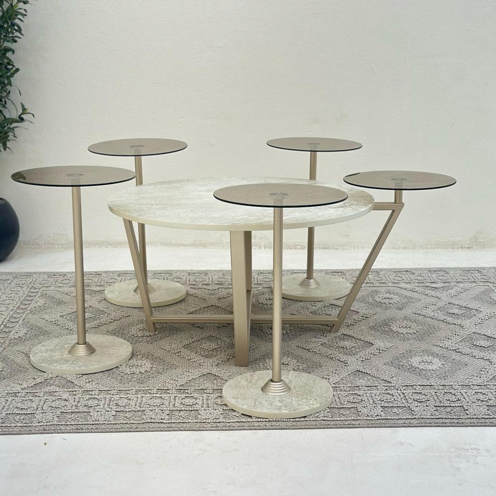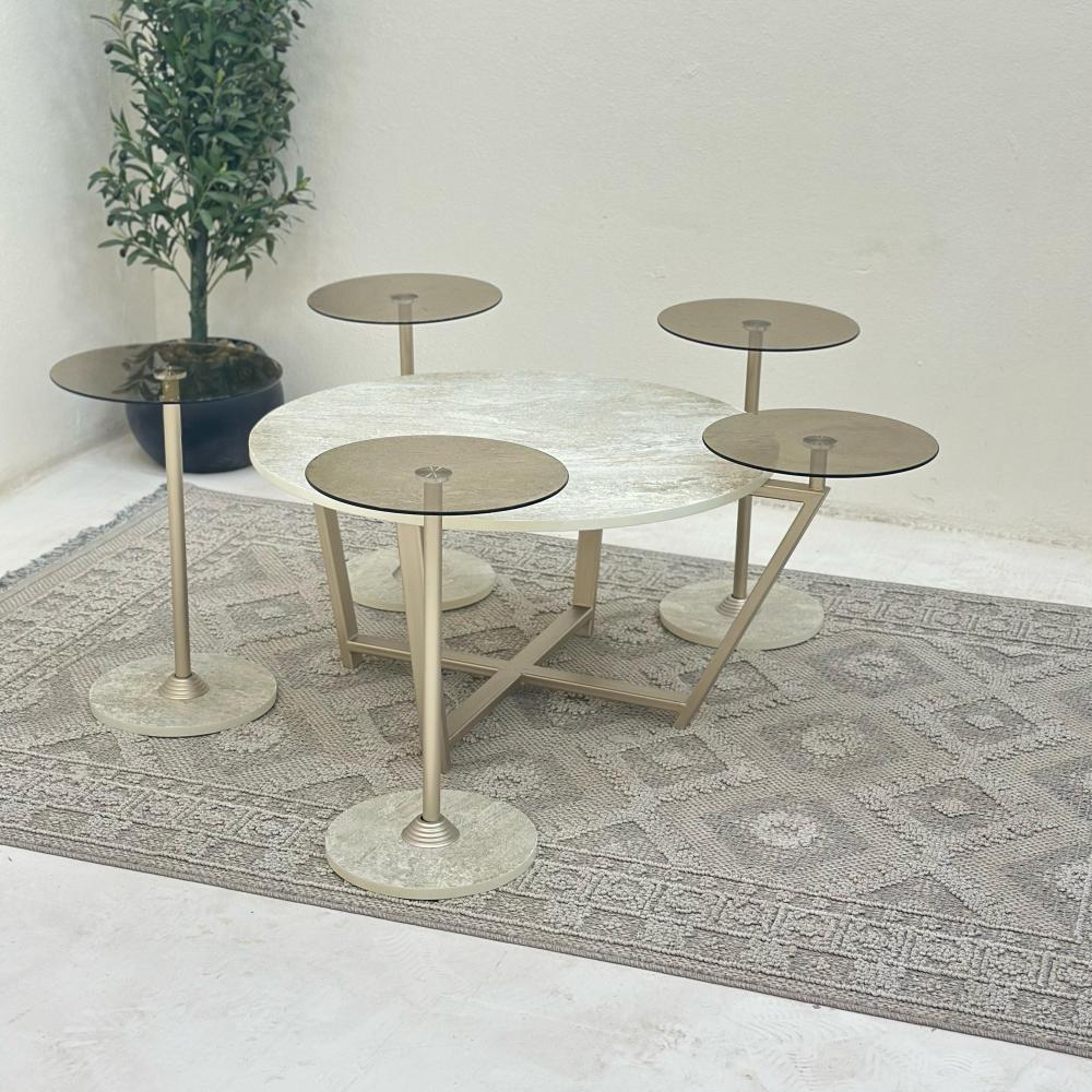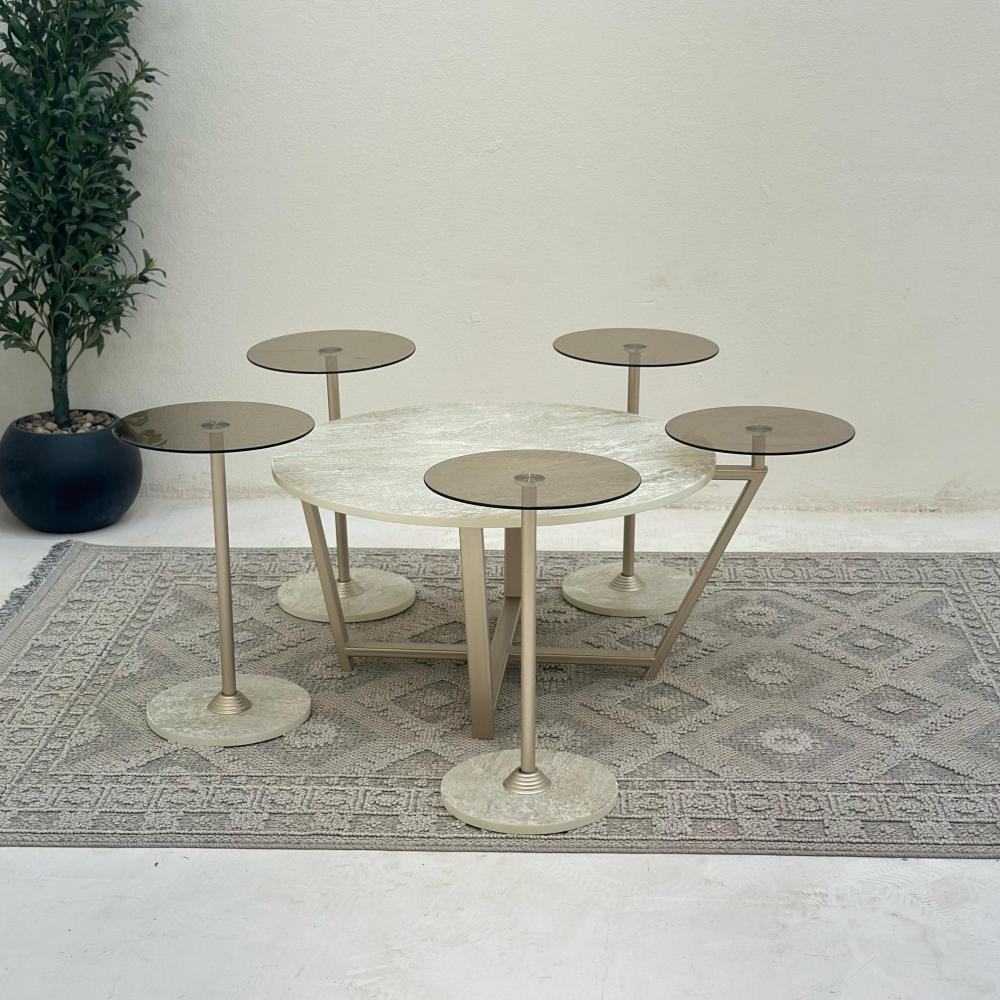 يُعتبر طقم طاولة القهوه الفاخر هذا إضافة مثالية لأي غرفة معيشة. يتضمن طاولة وسط و4 طاولات جانبية، الطاولة الوسط مصنوعة من الحديد الصلب وبديل حجر عالي الجودة. والخدمات الاربع مصنوعة السطح زجاج.. العمود حديد.. القاعده بديل حجر.. يضيف الشكل الدائري للطاولات لمسة من الأناقة إلى أي مساحة، بينما يضمن البناء الصلب القوي المتانة وطول العمر.