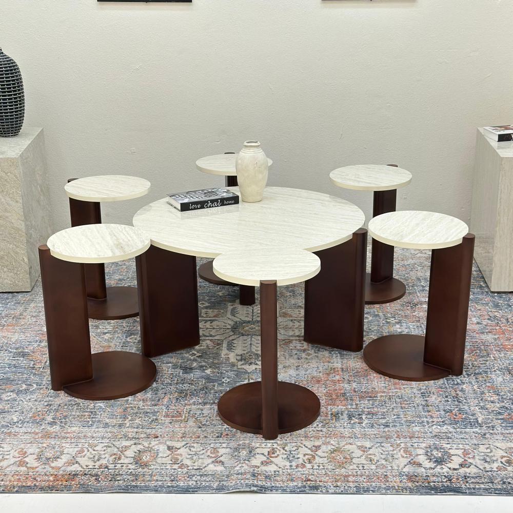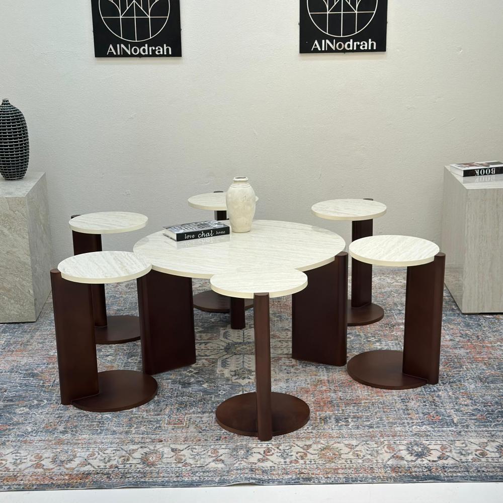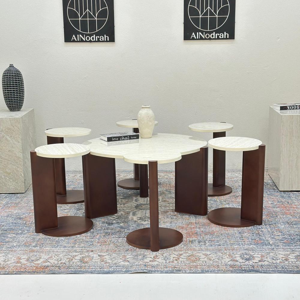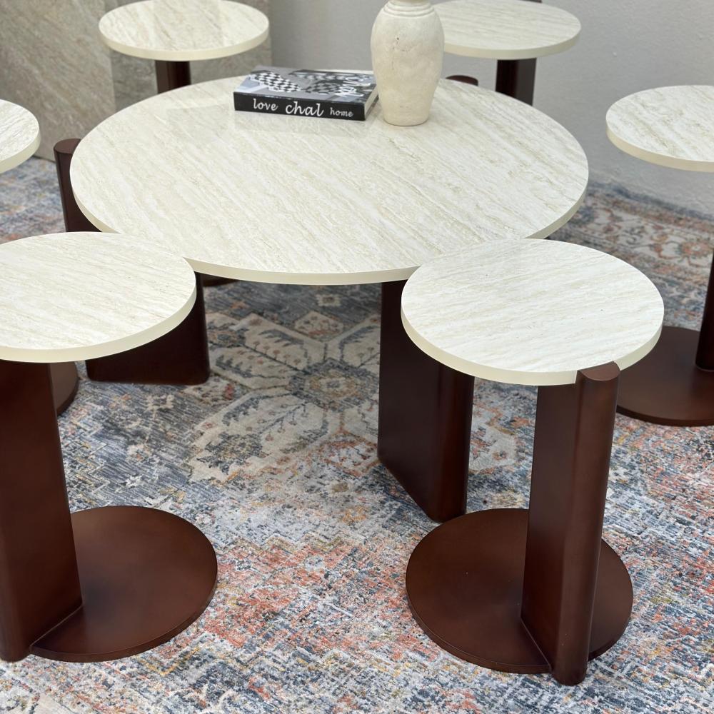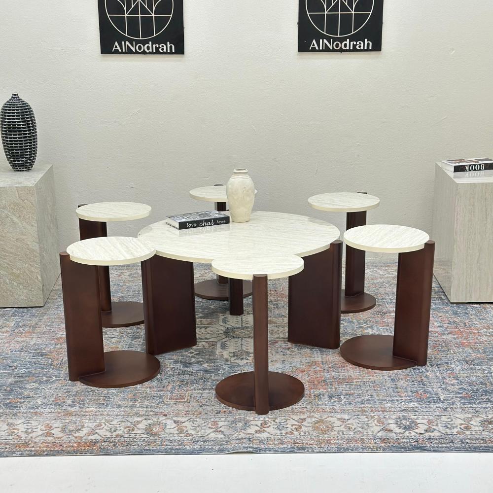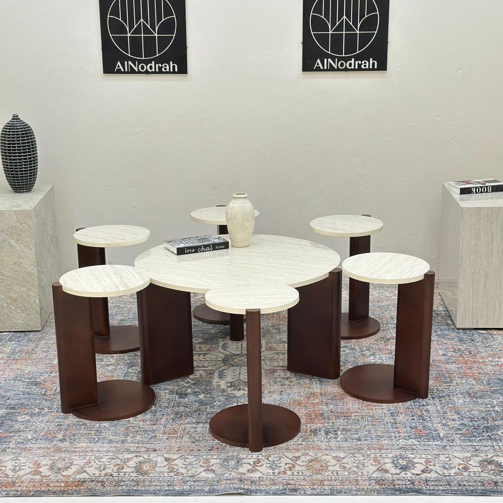 طقم طاولة التقديم الفاخر هذا إضافة مثالية لأي غرفة معيشة. يتضمن طاولة وسط و6طاولات جانبية، جميعها مصنوعه من بديل الرخام عالي الجوده والخشب الصلب ، يضيف الشكل الدائري للطاولات لمسة من الأناقة إلى أي مساحة، بينما يضمن البناء الخشبي الصلب القوي المتانة وطول العمر.